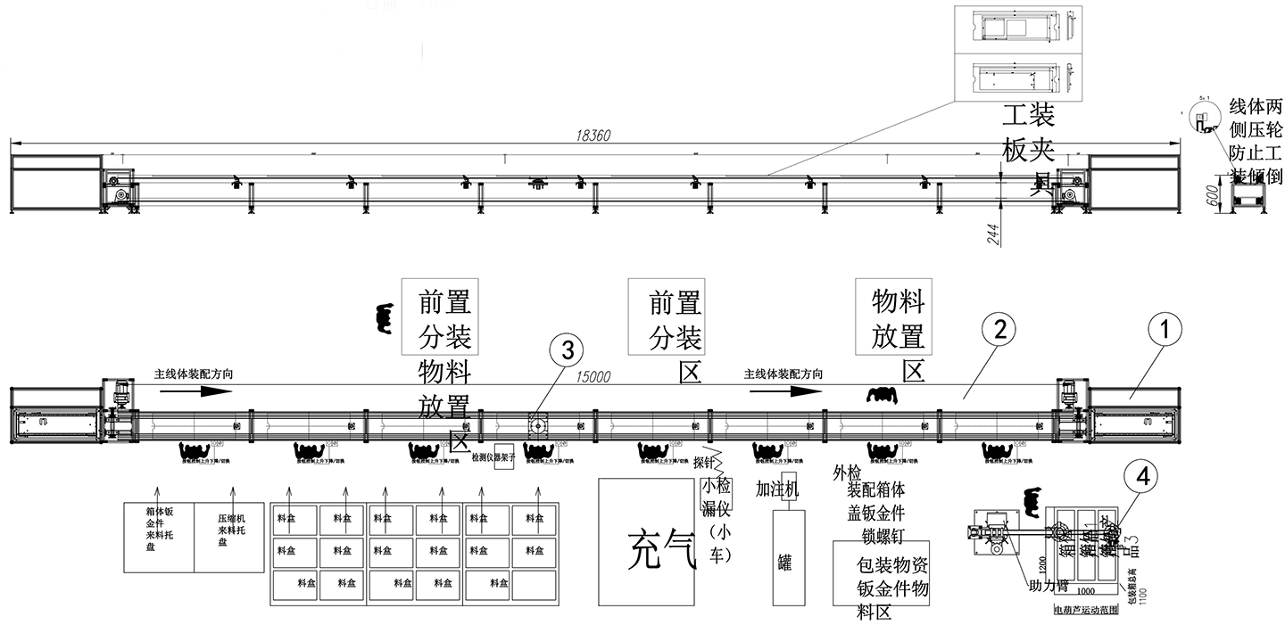 1、倍速鏈人工操作工位數8工位,主體線工位前方均為緩存工位,整體為一字型上下層循環回流線。如圖運作方向,通過頭尾提升機下層運作方向相反回流工裝板。